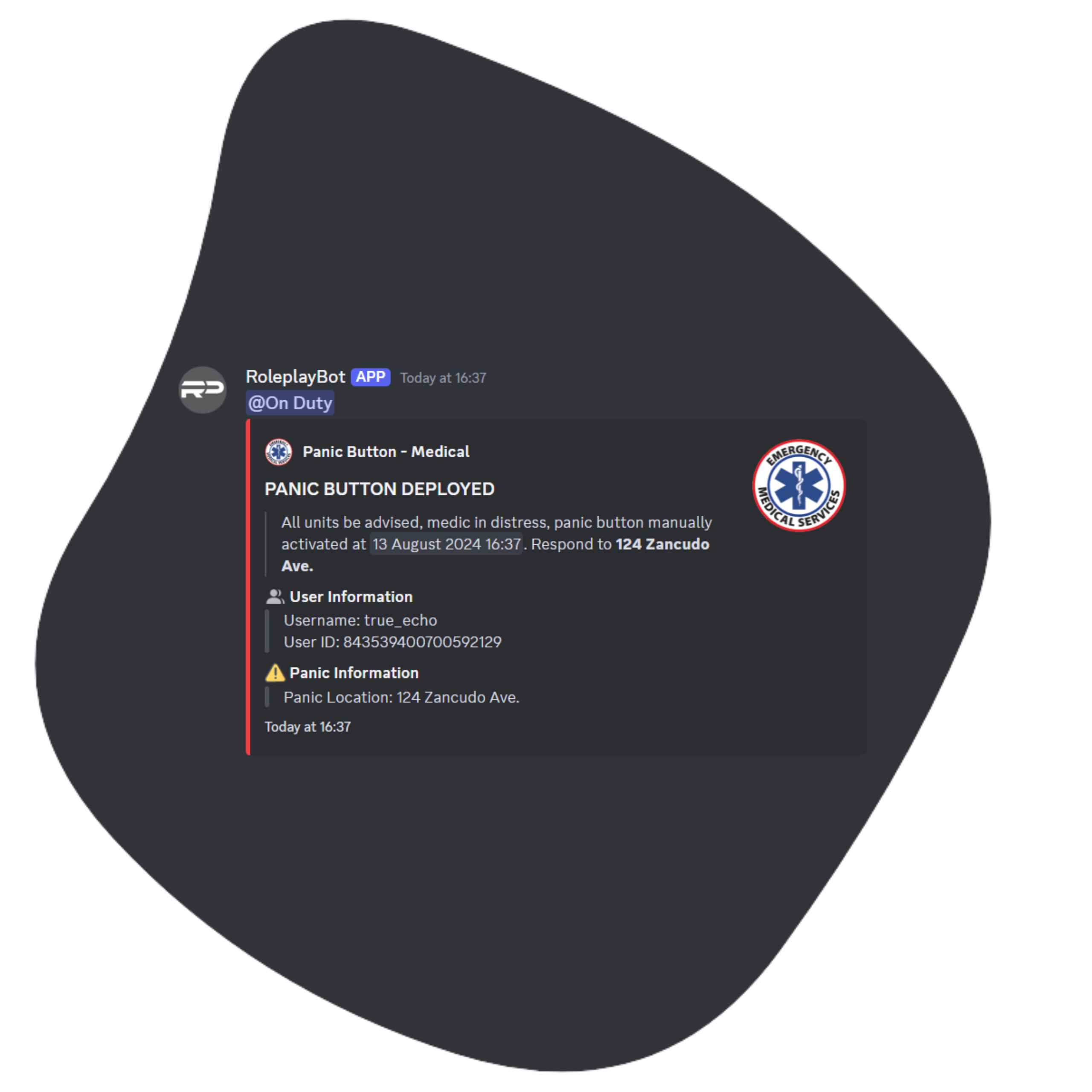 We also offers commands for Fire and Medical personnel which include commands that interact with civilians like; checking pulse, checking blood pressure, looking for injuries and others like a panic button for medical and a PASS alarm for firefighters, which send alerts throughout your current voice channel and inside the server.