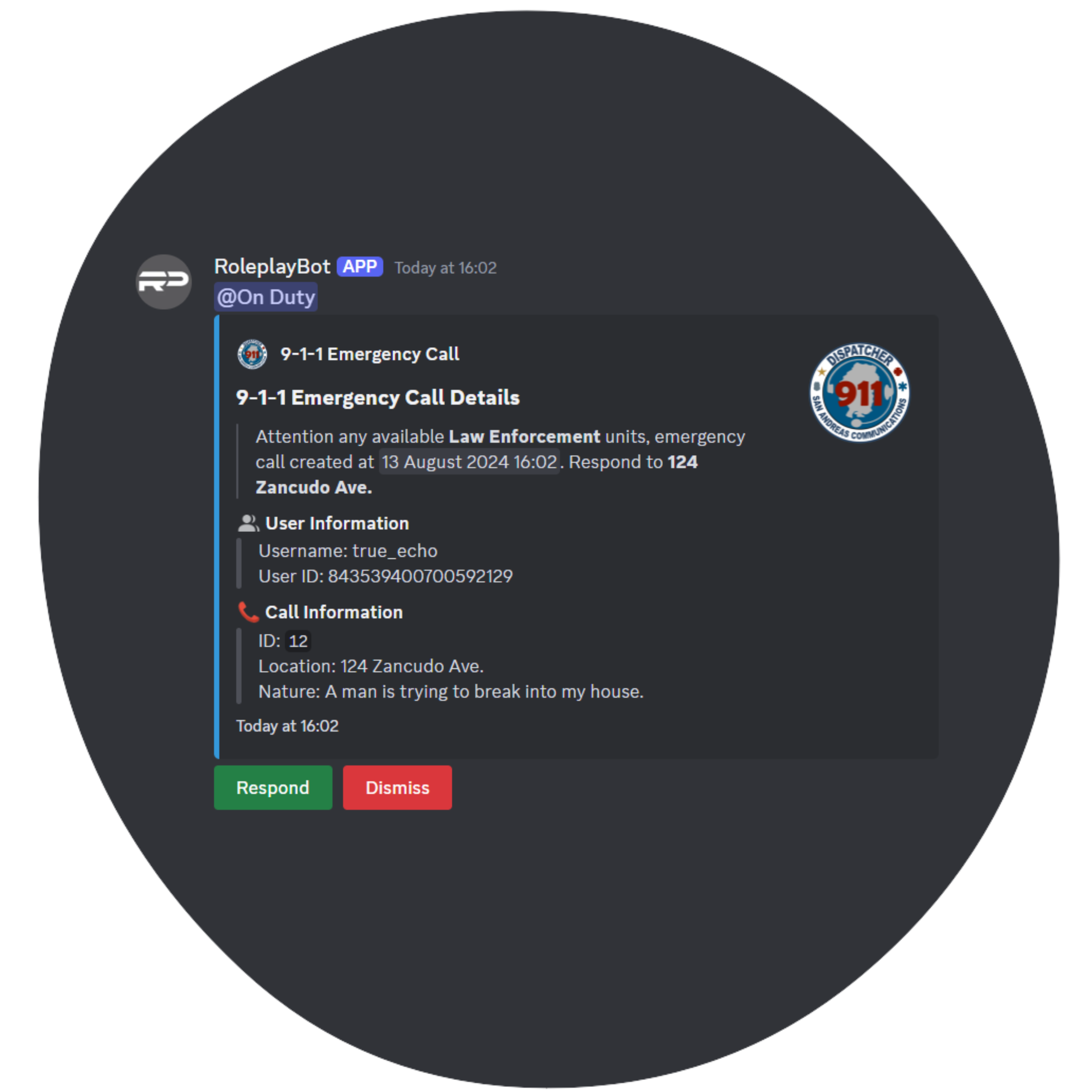 We also offer a range of general roleplay features, ranging from twitter, texting others, creating phone numbers, lockpicking padlocks, calling 9-1-1 and much more. To be exact, there is over 40 commands to play around with in our general module. Taking another look at our 9-1-1 calling system you will see the ability to respond or dismiss the call. On Duty units can use these buttons to interact with the call, which will alert the calling user.