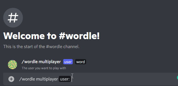 /wordle multiplayer <required: user> <required: word> - This will create a multiplayer game where you choose the user and the word they will be guessing