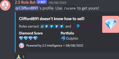 The 2.5 Role bot uses detailed intelligence data about their users' on-chain behaviors to give them a diamond hands, paper hands, and whale score, and set roles based on their scores!