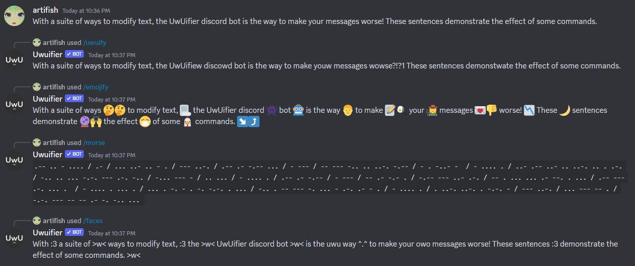 The Uwuifier discord bot is a easy way to mess around with text in discord. You can uwuify text, turn it into a emojipasta, or even convert it to morse code.