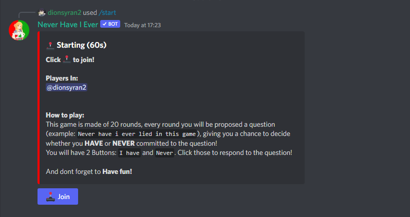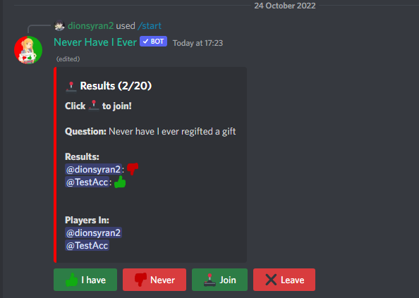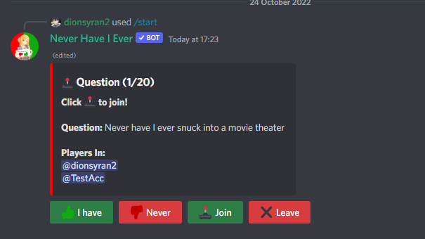 The best never have i ever bot i found. It doesn't just spit out a question and its an actual game! You have to try this if you want to have fun with your friends!