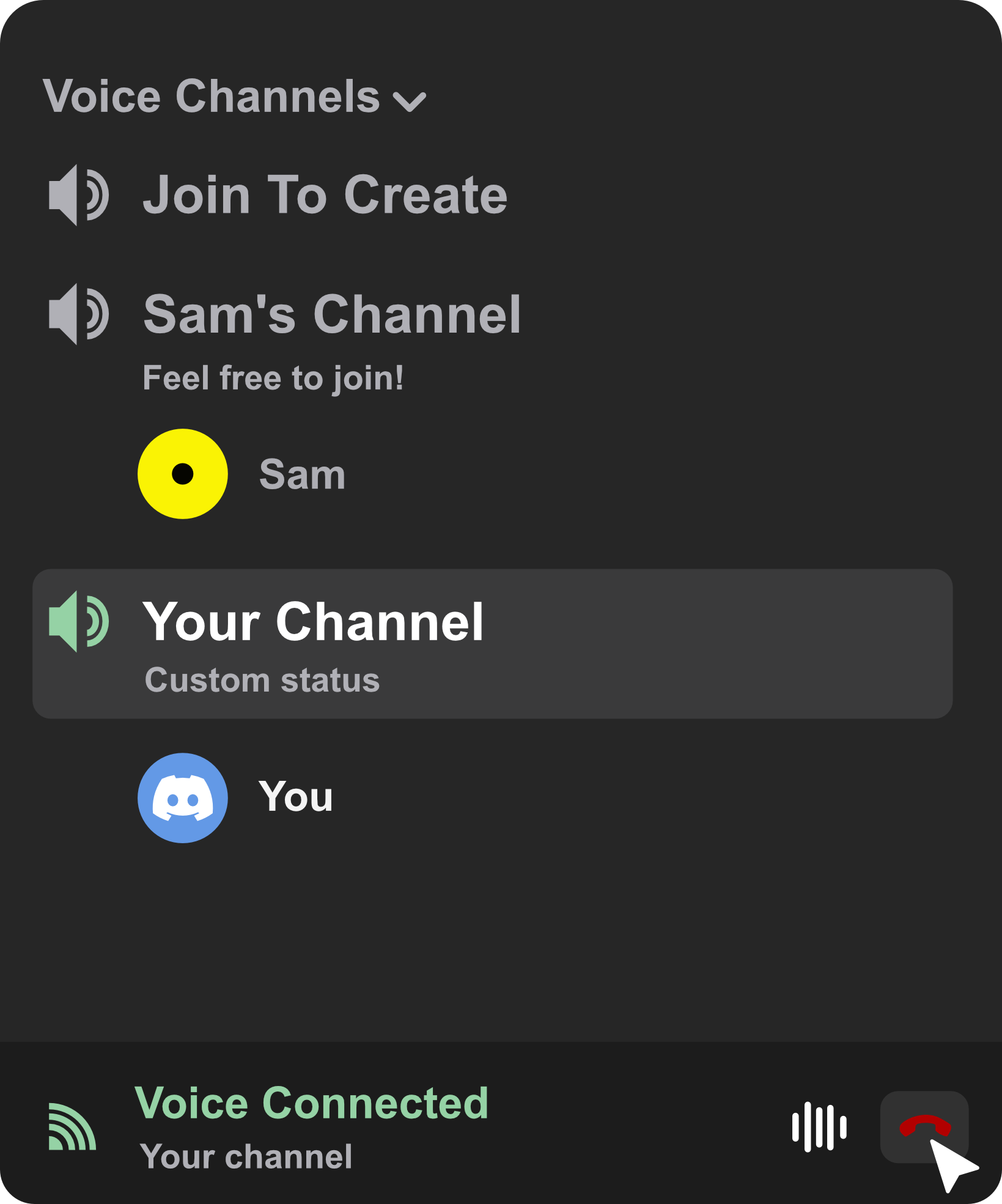 Create voice channels whenever you need them. When no one is left in a room, it is removed automatically so your lists do not fill up with dead channels.