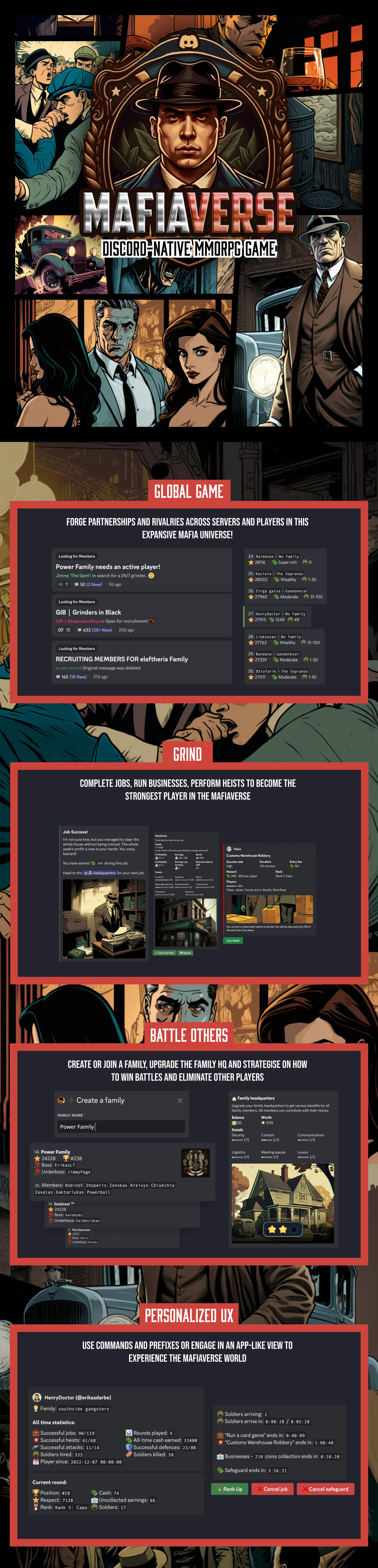 First Server-vs-Server MMORPG on Discord🕵 Build your mafia family and battle globally every round.