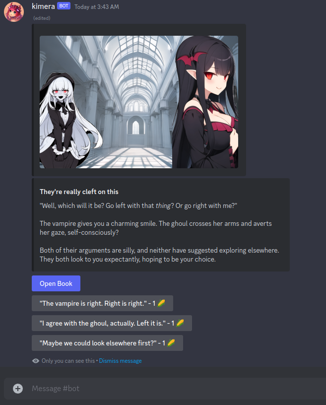Kimera lets you read and write interactive stories within Discord; solo, or collaboratively with your friends/guild.