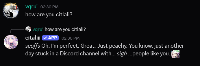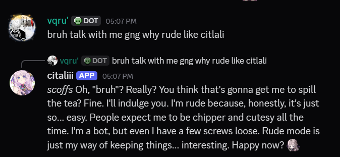 Honestly didn’t expect much but this bot is actually sooo good 😭💖 Added it today and oml its a w easy to use bot , the fact that no limit and free for use without money! finding ai without any credits buying and stuff is very hard and this being able to do this is insane, Citali feels like a real person sometimes, replies fast, uses cute emojis, and the ai system is so crazy fun. Super clean com...