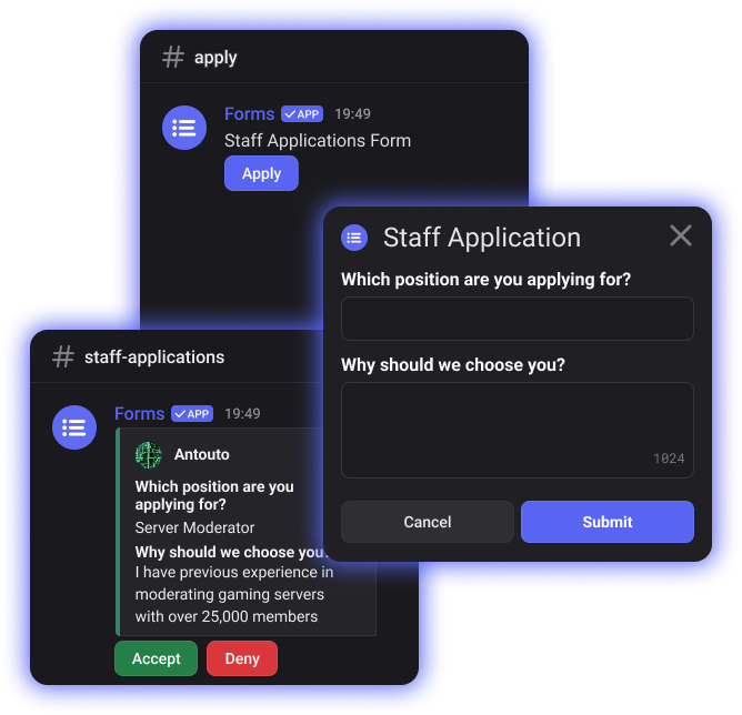 Create custom forms, applications, and tickets using discord's built-in modals.