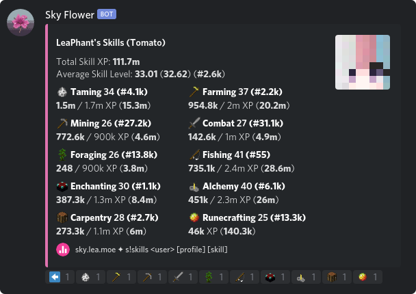 s!skills <user> [profile] [skill] – Get skill levels of a player.