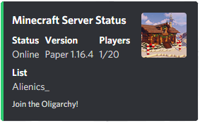 Very self-intuitive and effective bot for determining the status of any Minecraft server, would definitely recommend to any channel needing a bot of the likes. Layout is simple, sleek, and sufficient.