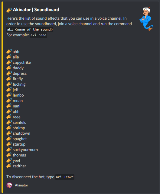 aki soundboard - NEW! A completely new Soundboard with 23 sound effects to play in the voice channel.