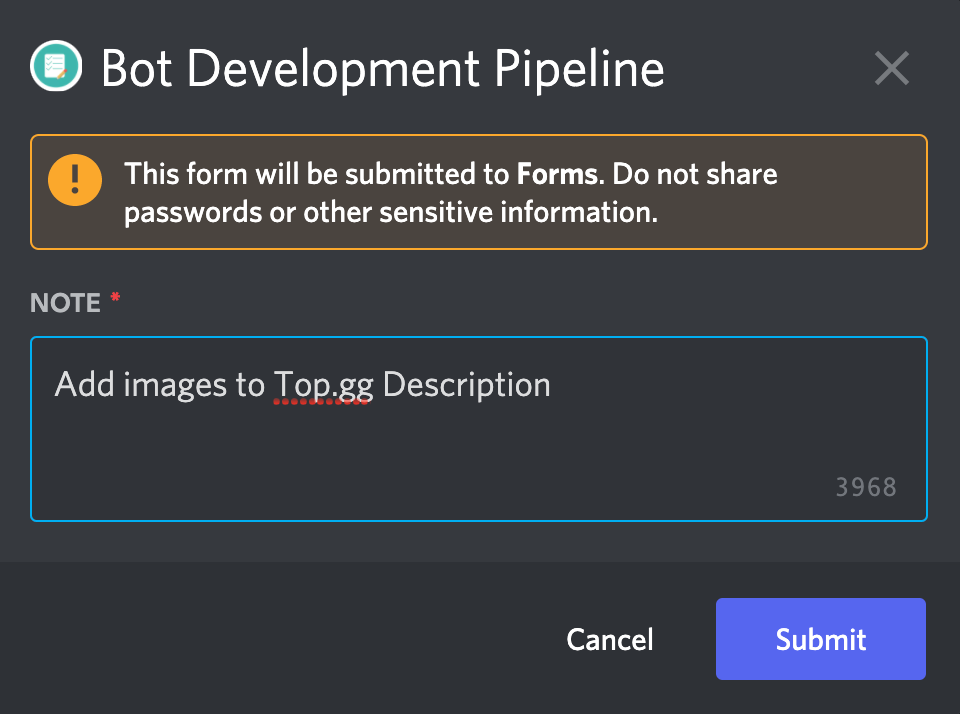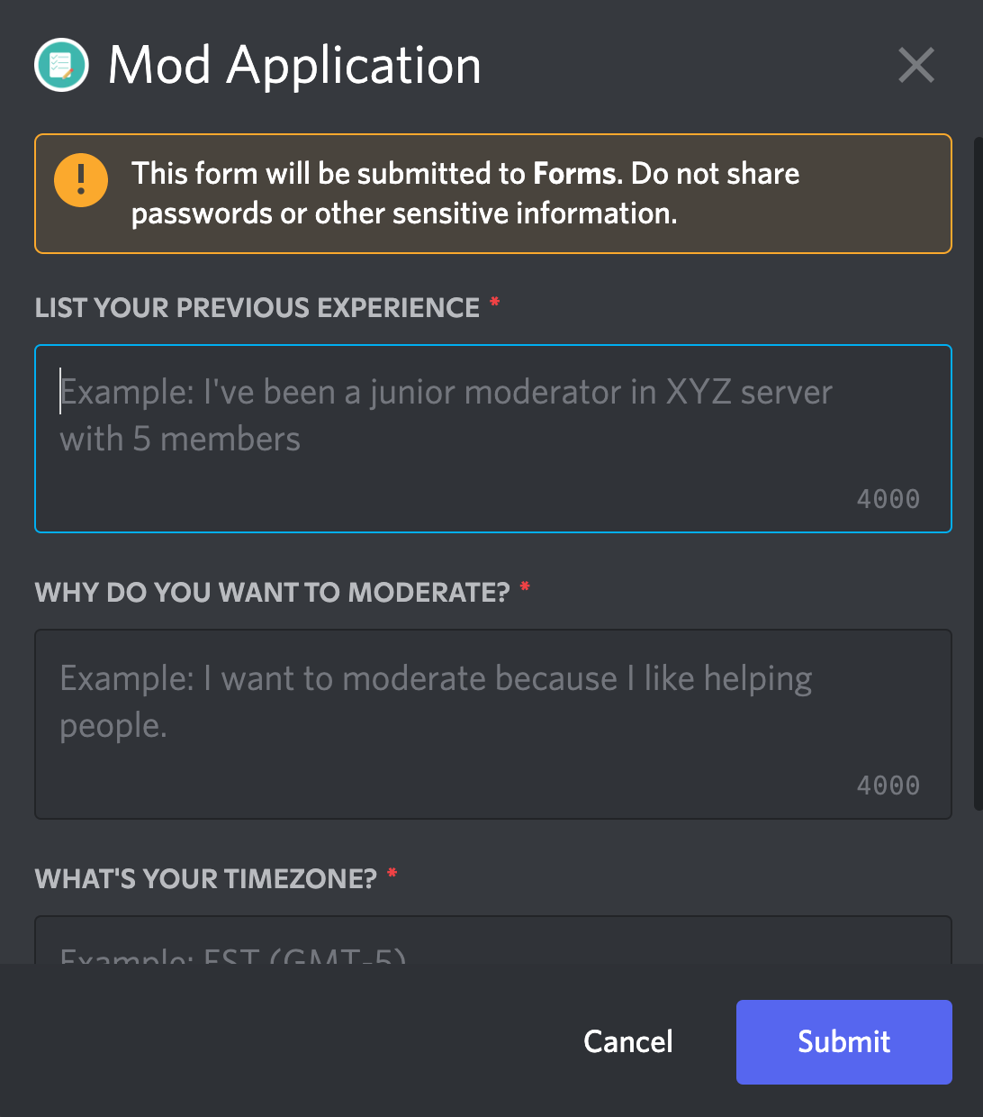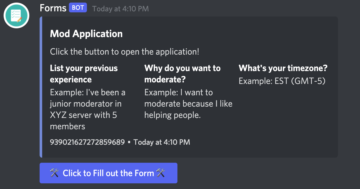 You can make forms for just about everything! Applications, event registration, complaints/suggestions, questionnaires, the list goes on! You can also create notes inside of Discord!