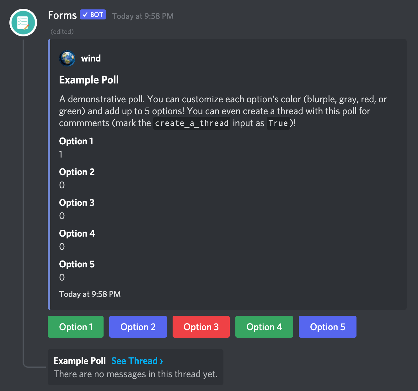/poll: create a secure poll (using buttons) with up to 5 options! You can choose what color each option is (blurple, gray, green, or red - set by Discord). You can also choose to create a public thread with the poll for comments!