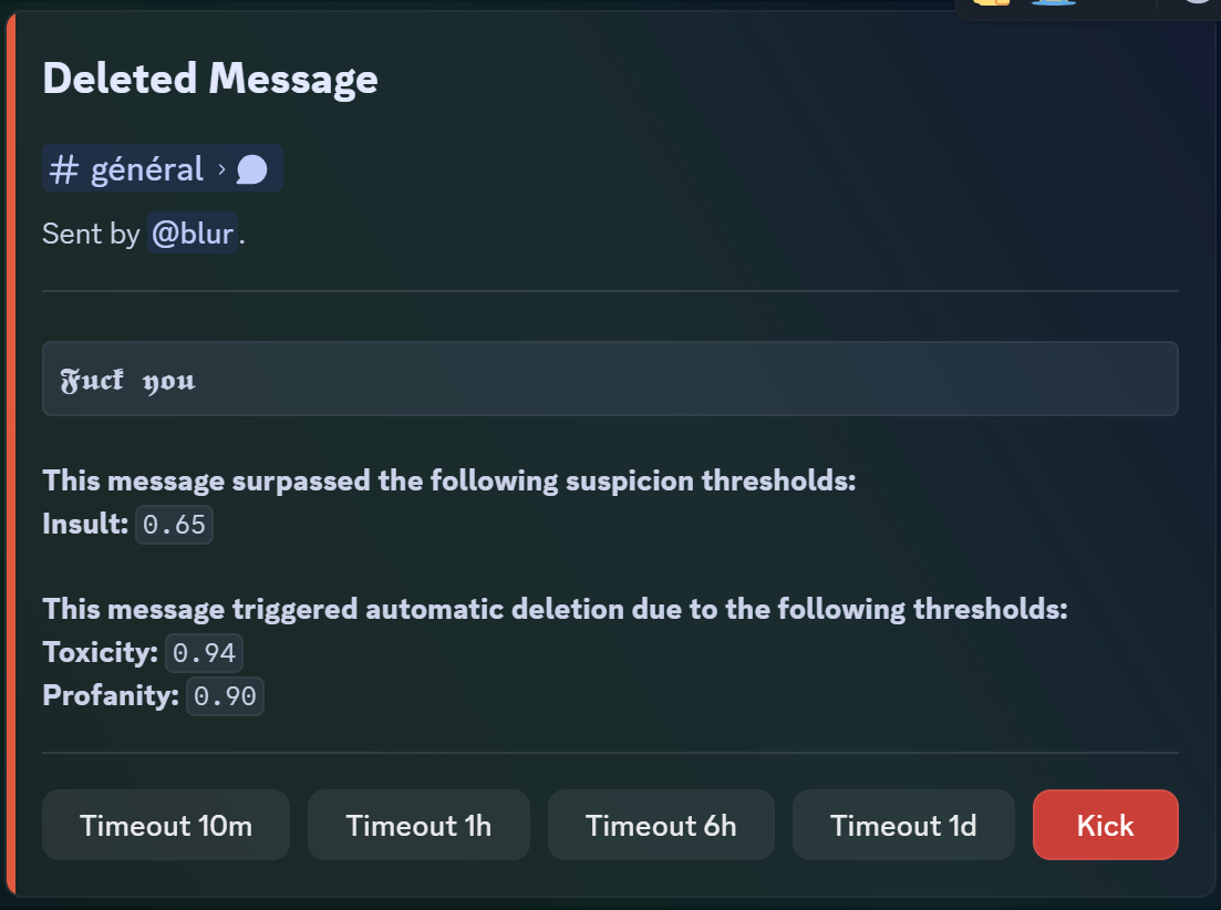 🎯 Easily Tailored Moderation ChatCop’s intuitive configuration lets you precisely adjust moderation sensitivity for your community. Set custom thresholds, ignore specific roles, and even define personalized deletion messages to match your server’s unique culture.