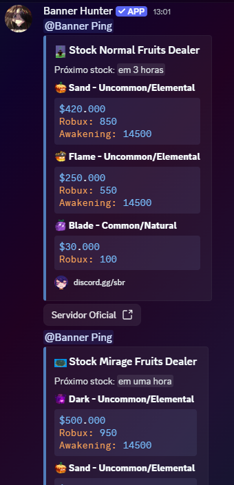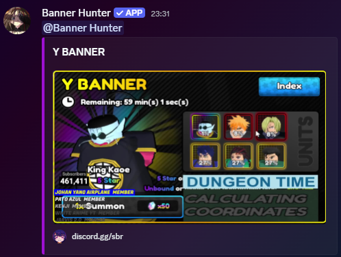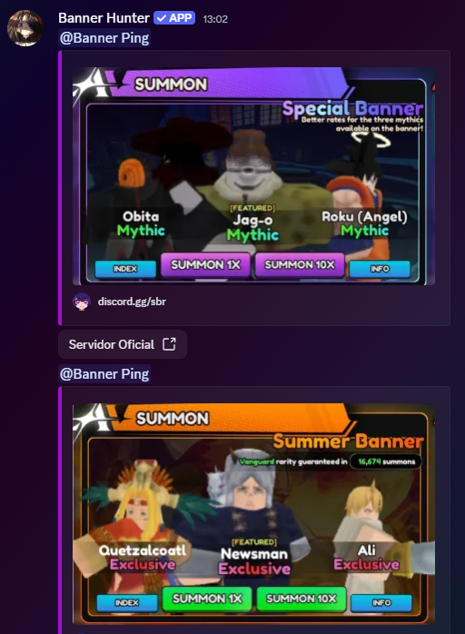 Já pensou em ter todos os banners dos seus jogos favoritos direto no seu servidor? 🎮 Com o Banner Hunter isso é possível! Basta adicionar o bot e usar o comando /config. Depois disso, seu canal entra na lista de postagens automáticas e você recebe cada banner novo sem precisar correr atrás. 🚀 Hoje o bot já cobre: All Star Tower Defense X, Anime Vanguards, Anime Last Stand, Universal Tower Defense, Ultimate Tower Defense, Anime Eternal, Anime Crusaders, Anime Final Strike, Anime Rangers X, Arise Crossover e Blox Fruits. E isso é só o começo: mais jogos serão adicionados em breve! Adicione agora e não perca nenhum banner! ✨