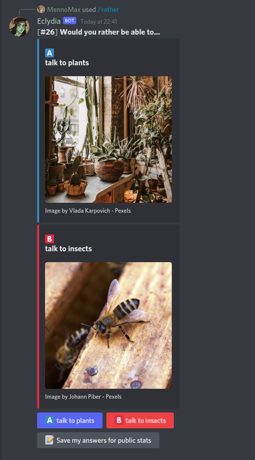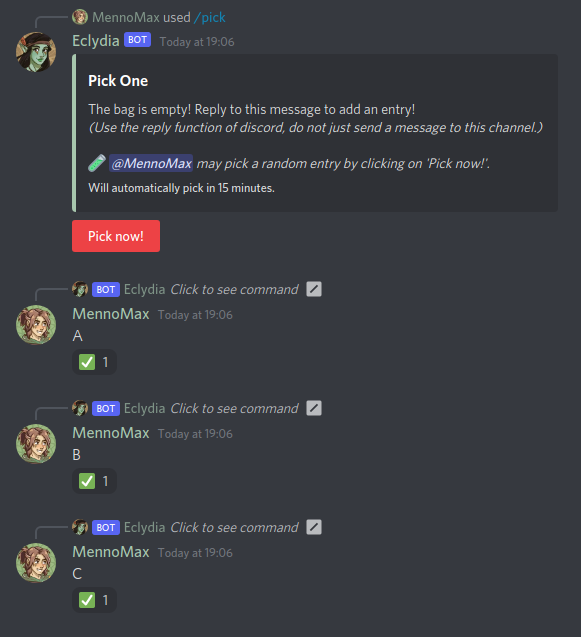 /pick - utility command to pick a random entry from replies to the bots initial message