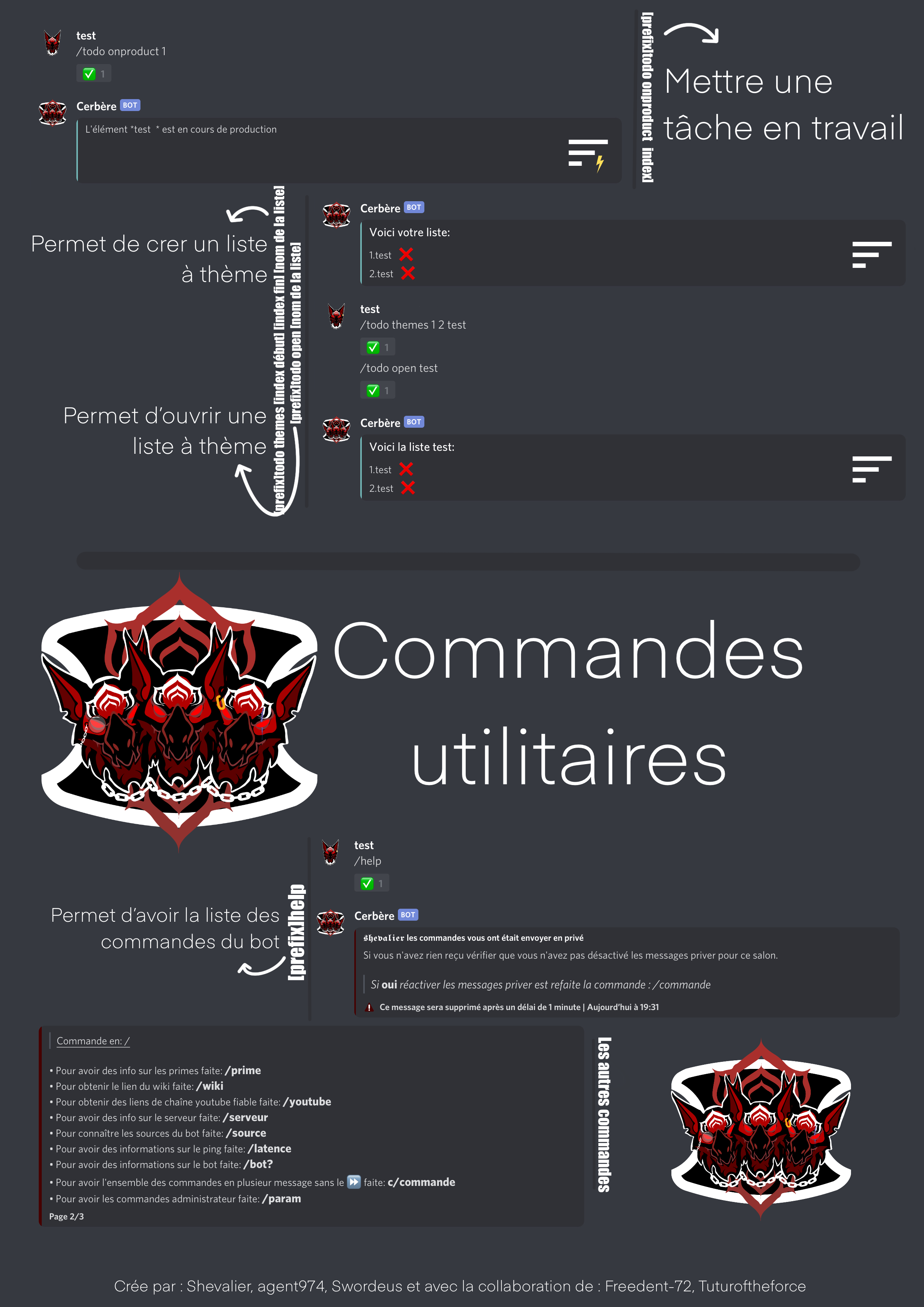 You would find commands such as : /commande, /prime, /Ping, /youtube, /source, /wiki, /bot?, /source, /serv, /kit allows to assemble kit gun and commande for the Todo Liste (for more information)