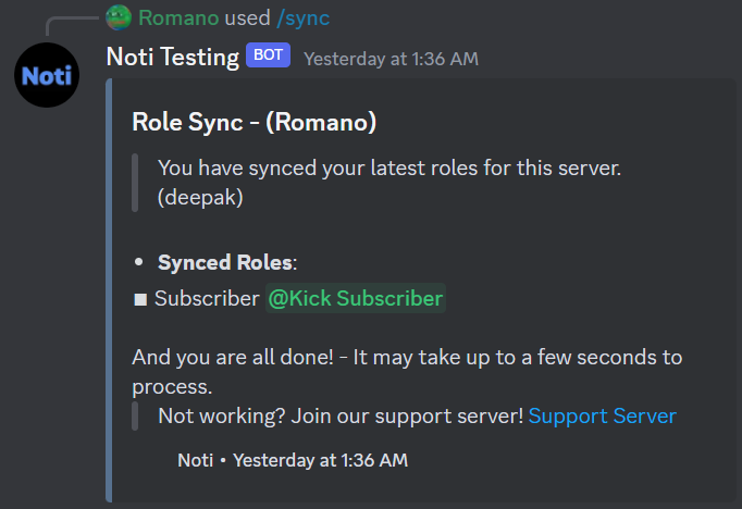 Noti notifies from Kick, TikTok, YouTube, Twitch, Rumble, Clips. Birthdays, Greetings, Badge sync, Giveaways, Starboard, Sticky messages.