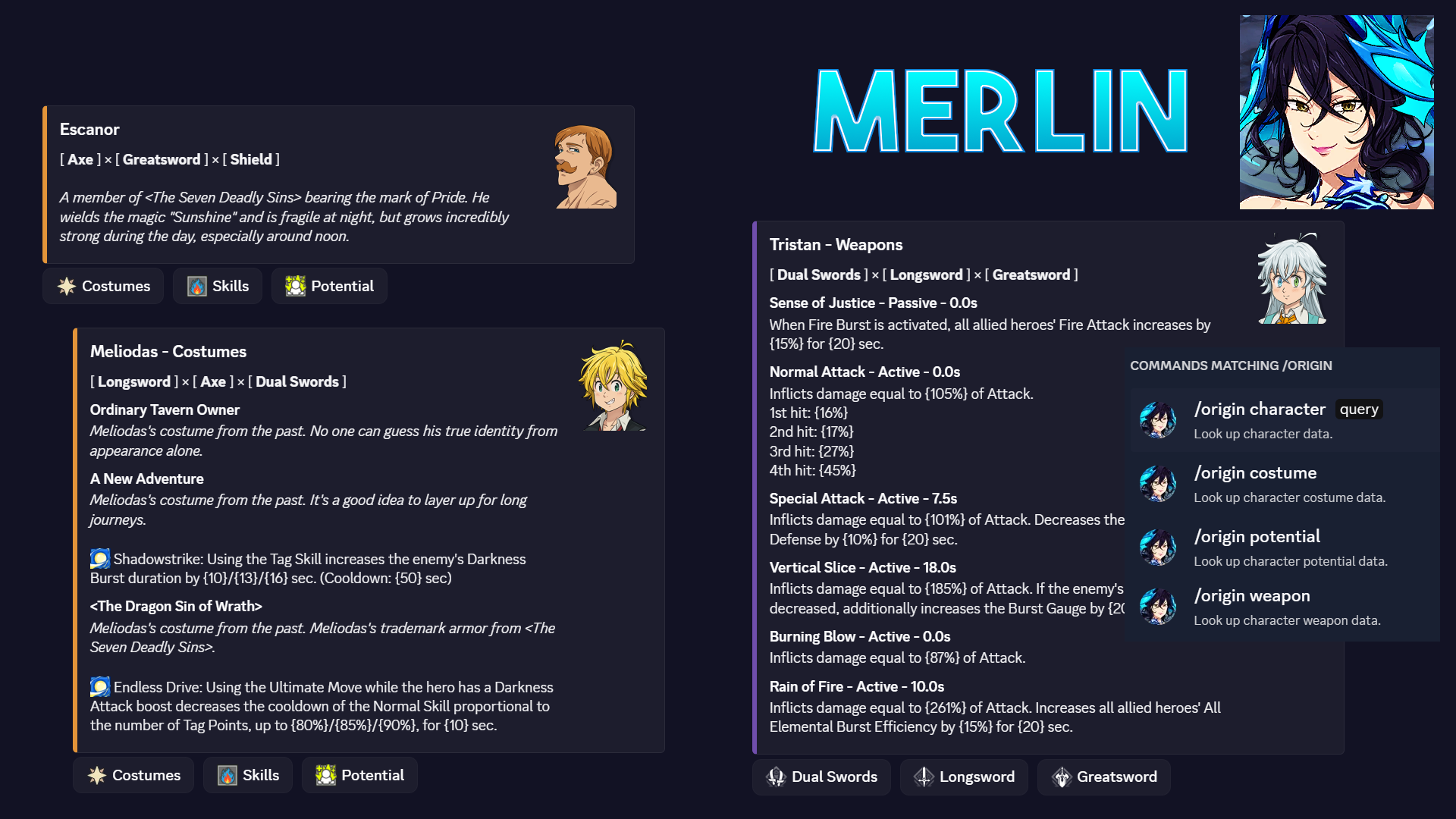 Here to guide you through the world of the Seven Deadly Sins. With a wide range of structured commands, you can easily retrieve information from the live games The Seven Deadly Sins: Origin and The Seven Deadly Sins: Grand Cross.