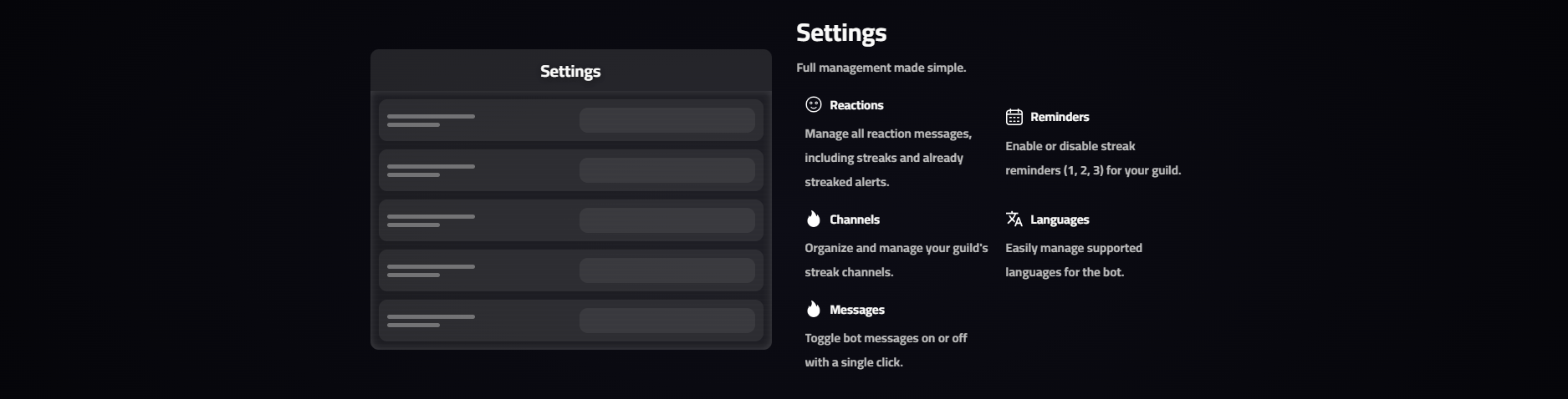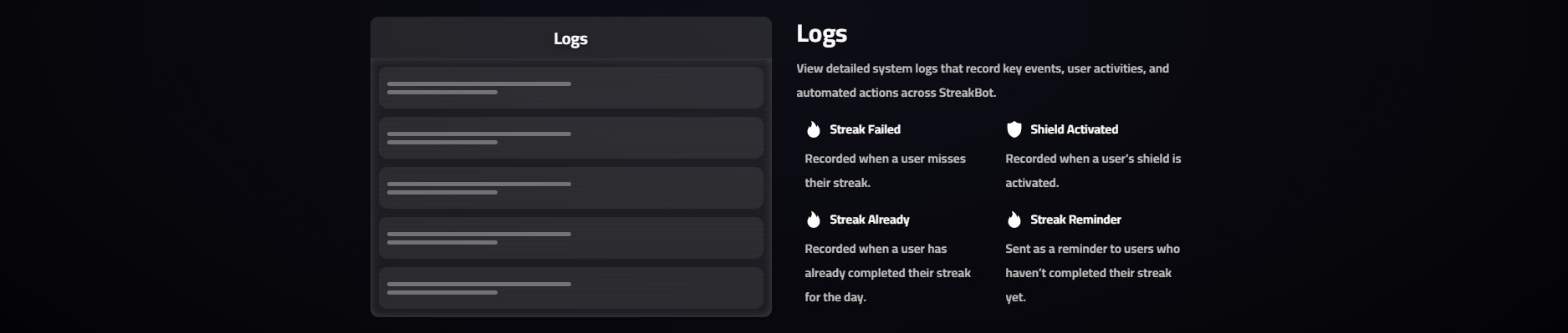 StreakBot helps your Discord community stay active and connected. Track your daily streaks by sending photos, videos, GIFs, stickers, YouTube videos or voice messages — All while competing with friends through leaderboards and rankings. Supporting multiple languages, StreakBot brings energy, fun, and consistency to your guild.