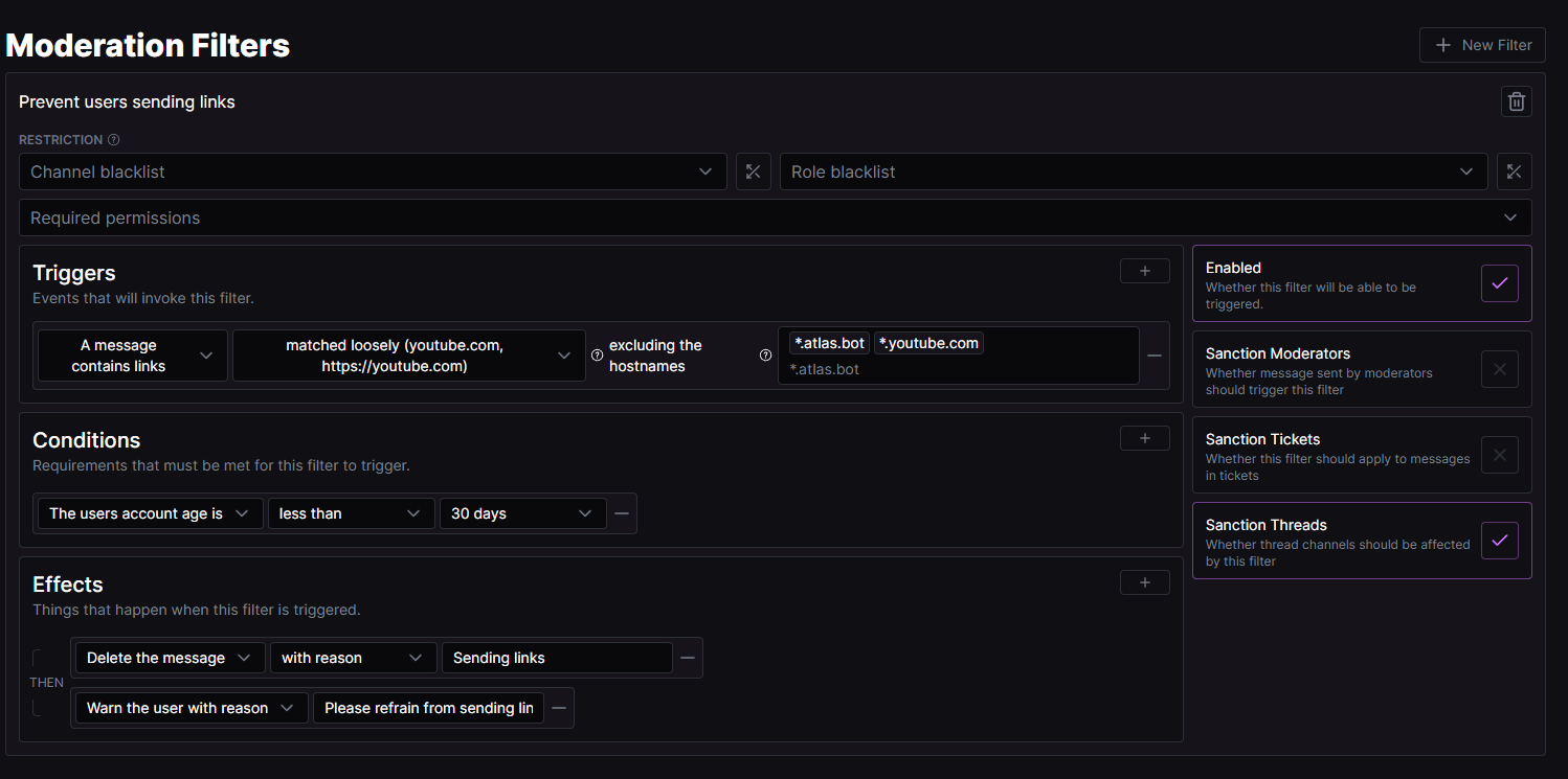 I just made a new server and I wanted a bot with a Web - Dashboard and one that was fully coustimisable and I found Atlas! Atlas is the best bot I have ever used inside of my server. It has good Moderation and Utilizeing commands! I would recommend this bot to any of my friends! I believe this bot is better then some on the good ones like Carl-Bot and possibly Wick! I upvote this bot every time ...
