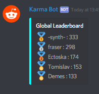 Ayo I love this robot so much the people in my server (I run Wolley's Producer Club and The Crack Plugs Server with over 3,000 people) and it allows me to get votes to understand people opinion quickly it is sure a must have and is more than getting karma itself could you add an option to choose which items to upvote? (Upvotes Pictures but not MP4 files etc) and also allow us to customise the bot ...