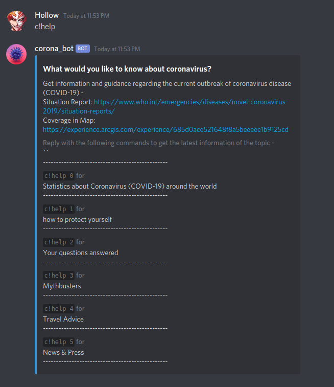This bot gives information about COVID-19 outbreak, prevention and safety measures as well as stats