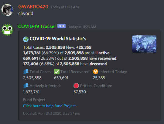 This bot tracks each countries/states data for COVID-19 cases & displays it beautifully in discord.