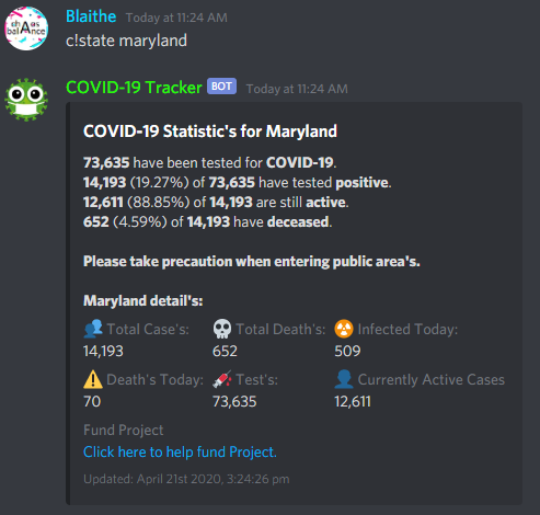This will display this info neatly in discord using an embed with the commands below. This will also display the percentage of your state/country is infected & how much of the population is infected.