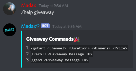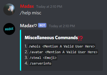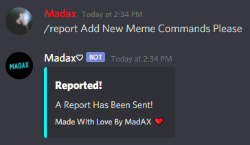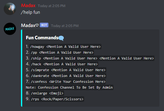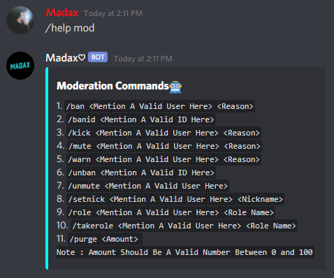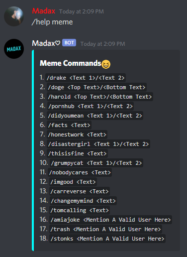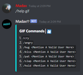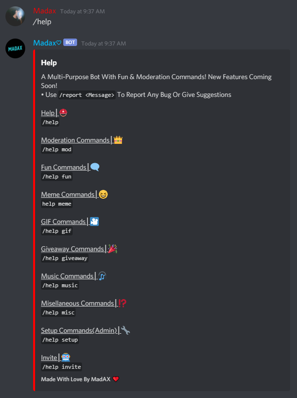 /help For The Help Menu/help mod For The List Of Moderation Commands/help fun For The List Of Fun Commands/help meme For The List Of Meme Commands/help gif For The List Of GIF Commands/help gif For The List Of Giveaway Commands/help misc For The List Of Miscellaneous Commands/music For The List Of Music Commands/invite - Gives The Invite Link For The Bot And The Support Server/report - Report Command For Bugs/Suggestions0