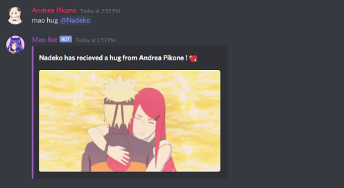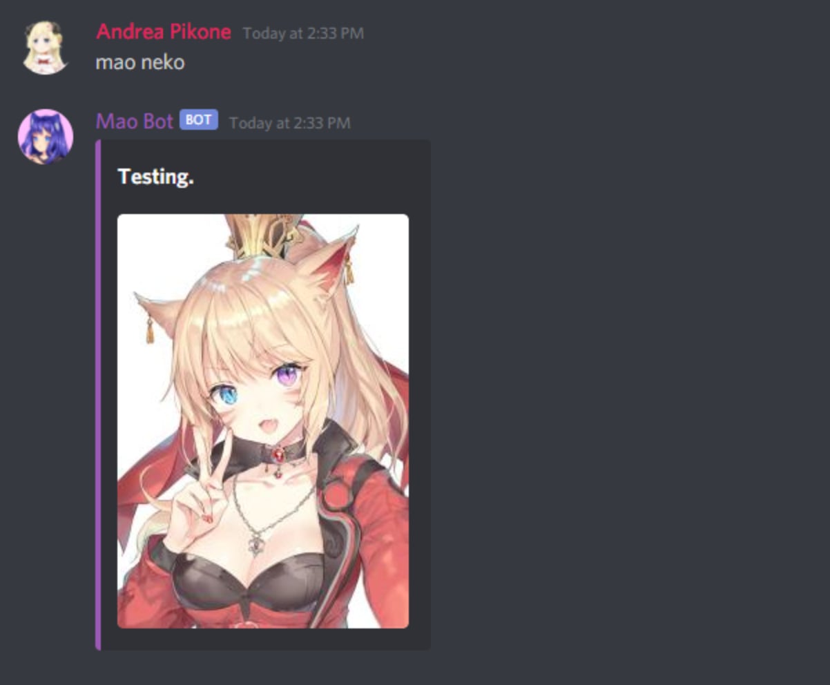 Come join in with tons of fun! Mao Bot allows you to roleplay, moderate, fetch cute pictures of nekos, & more! New features are added on a regular basis, so there's no reason not to add her to your server today! Mao Bot comes with: