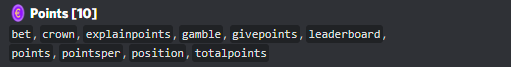 Points: Daily points system, every message gives 1 point, at the end of the day the user with most points is crowned, and the points are reset for the next day.