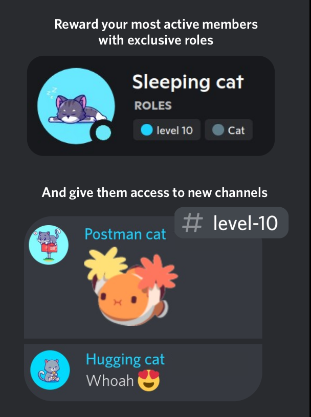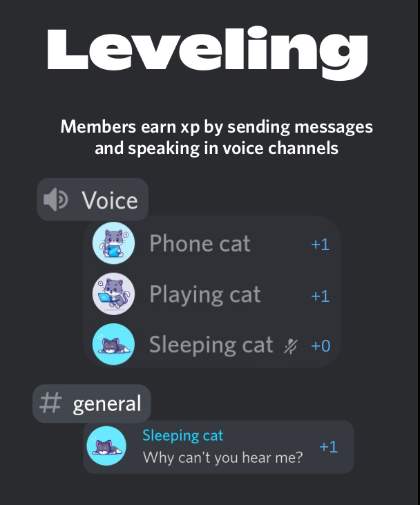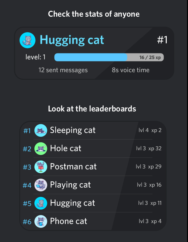 Send messages and speak in voice channels to earn xp. Reach the top of the leaderboards and unlock new roles.