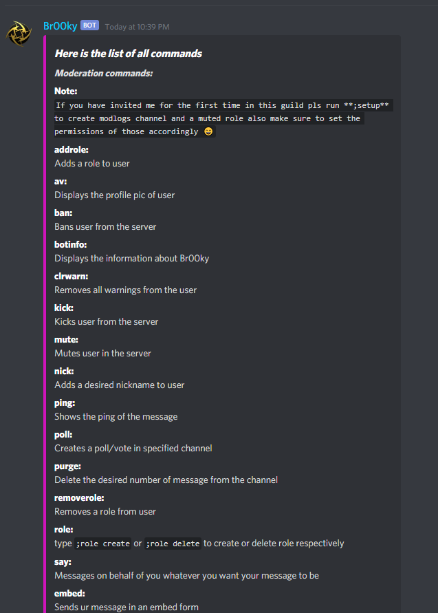 Br00ky is a new generation moderation bot with some very cool features like fun commands. if you type ;rip and tag a user after that bot will generate an emoji with a coffin stone and a pfp of the user in it, if you type ;avf and tag 2 consecutive users bot will generate an image through api in which the pfp of both users get merged with each other there are several uses of bos in moderation too, you can mute/kick/ban a misbehaaving user from guild or evenunban a user whom u want to forgive also you can strike a user for misbehaving and so on. so basically this bot is created for our beloved user who can use this without any issues and still if u have some issues please feel free to join our support server we will surely listen to ur issues and rectify them as soon as possible :)